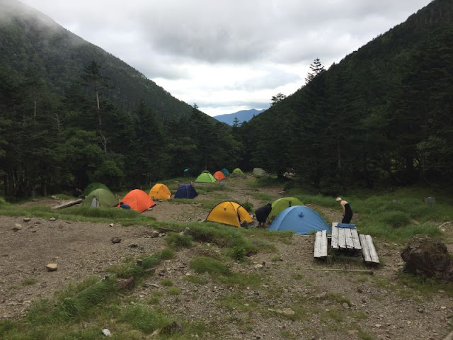 聖平小屋に到着。テント泊は予約制で定員はいっぱいだったが、沢を越えたエリアに空きがあったので無事テントを張れました。張ろうとする場所に近づいてきてなぜか煙草を吸いだすオバサンがいたのは謎だったな。まあ無事にベストポジションでテントを張れてひと安心。