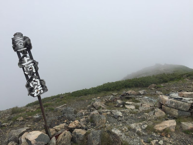 上河内岳からの眺めを楽しみに歩いてきたが、山頂に近づくにつれ、あいにく雲の量が多くなってきた。分岐にデポして上河内岳の山頂へ。10分ぐらいお菓子を食べながら粘ったが、やはり雲に覆われ周囲の景色は堪能出来なかった。また次回の楽しみに残しておこう。